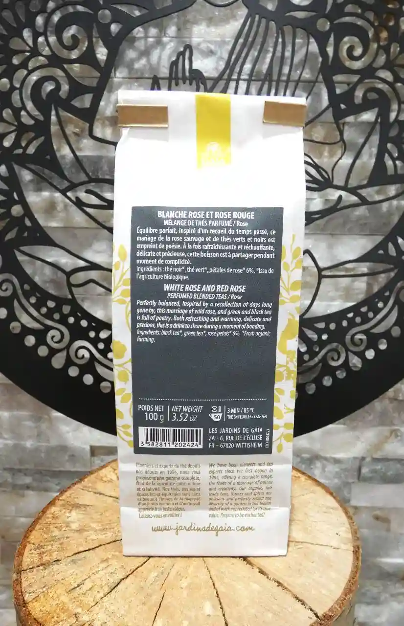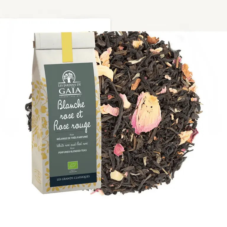 Découvrez le Thé noir Blanche rose et Rose rouge bio, pour une pause envoûtante et raffinée.