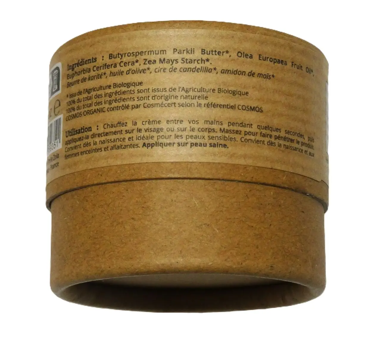 - Composition (français) : Beurre de karité, huile d'olive, cire de candelilla, amidon de maïs. 100% d'ingrédients bio. 100% d'ingrédients d’origine naturelle.