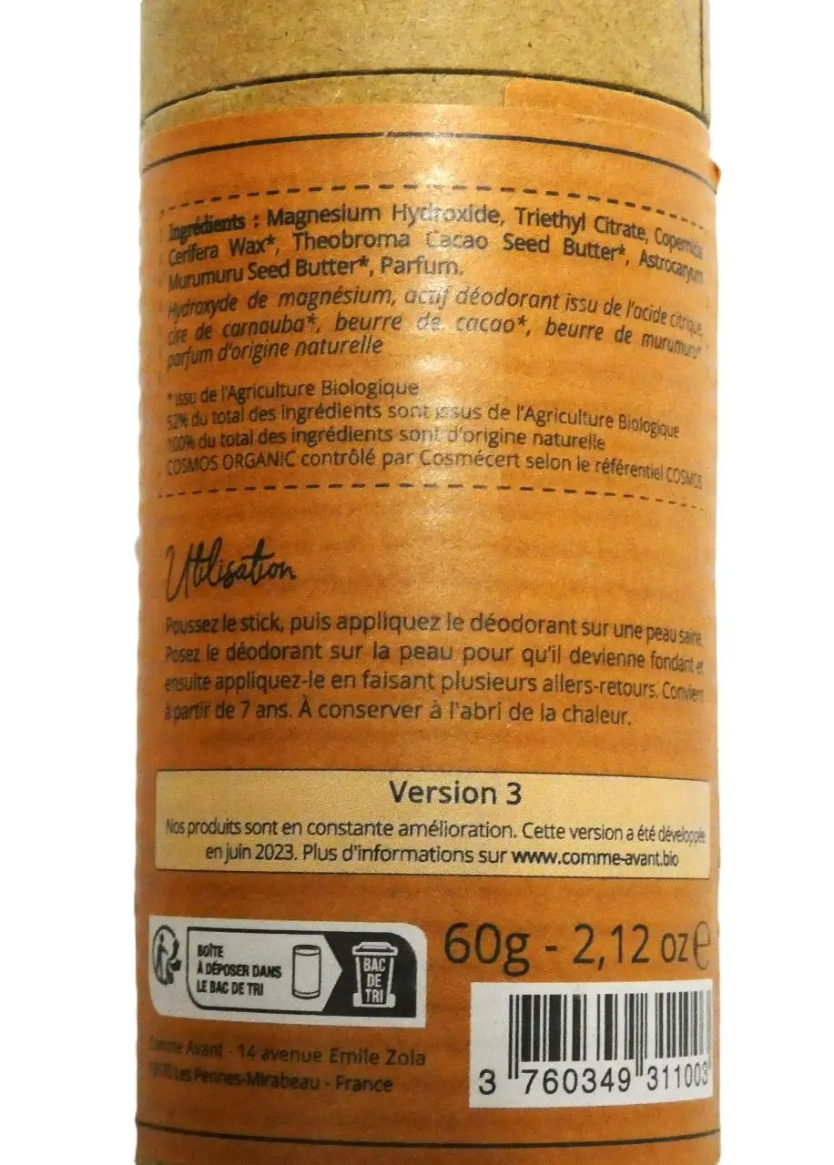 - Composition (INCI) : Magnesium Hydroxide, Triethyl Citrate, Copernicia Cerifera Wax, Theobroma Cacao Seed Butter, Astrocaryum Murumuru Seed Butter, Parfum. 52% d'ingrédients bio. 100% d'ingrédients d’origine naturelle.