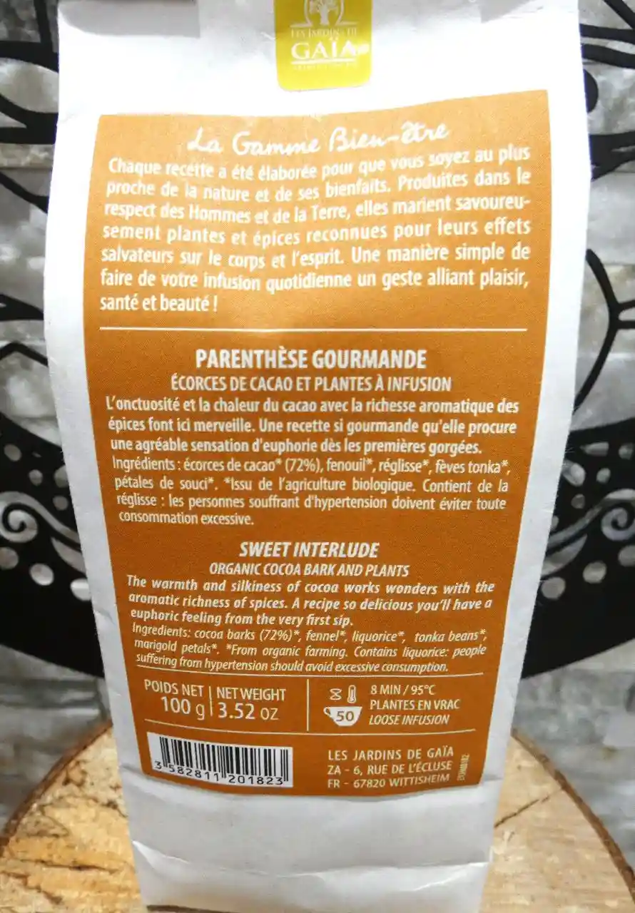 Tisane bio Parenthèse Gourmande des Jardins de Gaïa : cacao et plantes à infusion pour une infusion gourmande sans théine. Certifiée bio et équitable.