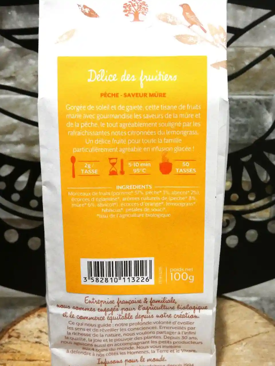 - Composition : Morceaux de fruits (pomme 37%, pêche 3%, abricot 2%), Écorces d’églantine, Arômes naturels (pêche 8%, mûre 6%, abricot), Écorces d’orange, Lemongrass, Hibiscus, Pétales de souci. 100% d’ingrédients d’origine naturelle, 100% issus de l’agriculture biologique.
