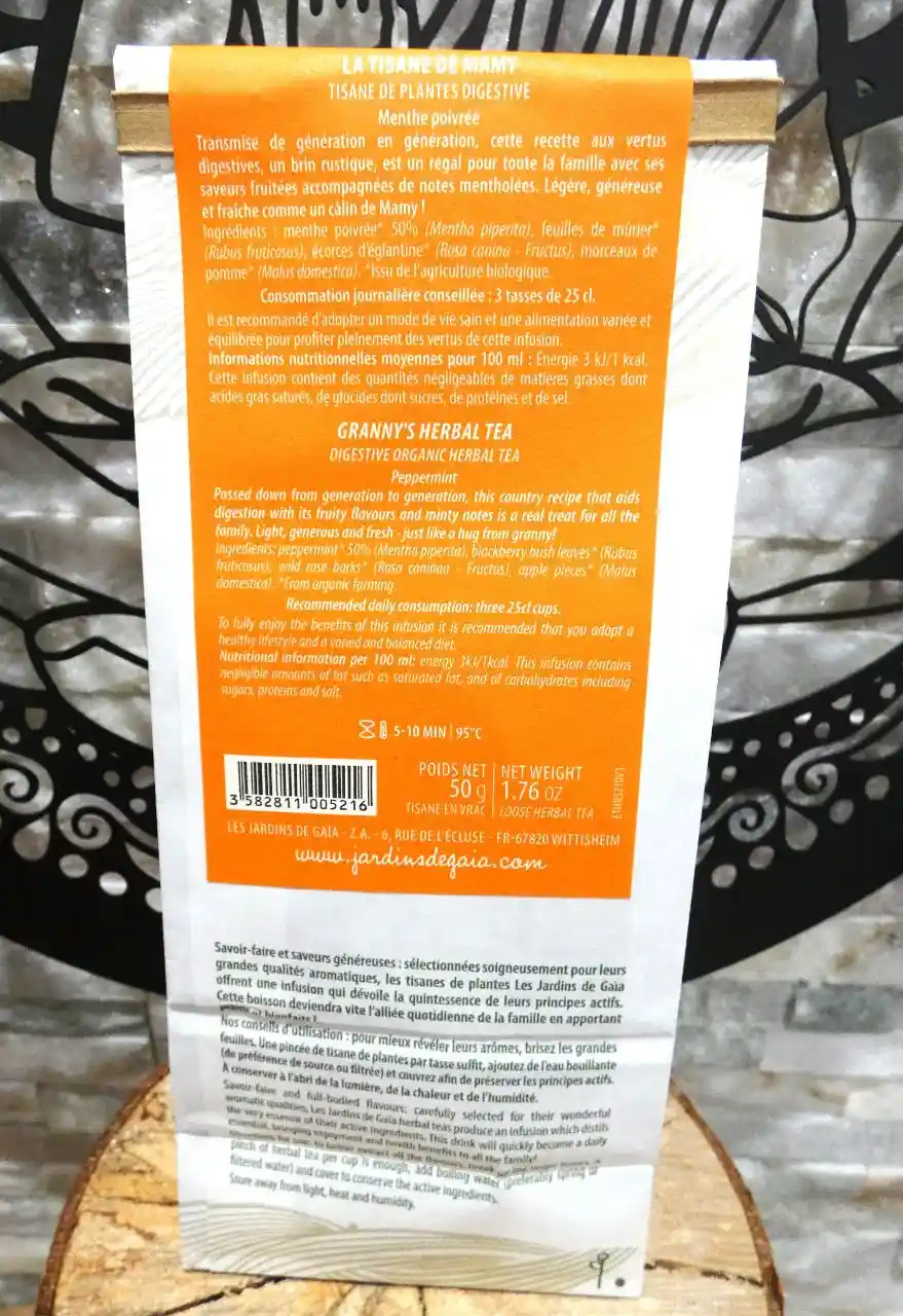 Tisane bio La Tisane de Mamy des Jardins de Gaïa : menthe poivrée et fruits pour une infusion digestive fruitée.