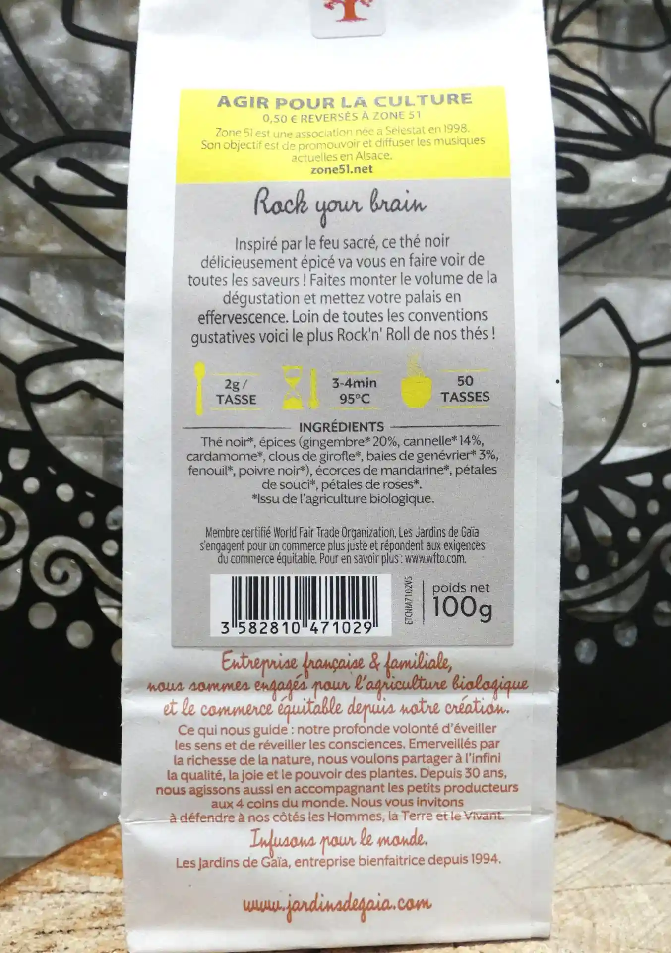 Le Thé noir Rock your brain bio (100g), proposé par Ker-Gaïa, est une infusion électrisante pour booster l’esprit. Certifié biologique (AB) et issu du commerce équitable (WFTO), ce thé noir marie gingembre, cannelle et baies de genévrier. Ses saveurs chaleureuses et relevées évoquent un concert enflammé, où chaque gorgée réveille les sens avec une pointe d'épice. En sachet recyclable, 0,50 € par produit soutient Zone51 pour les musiques actuelles. Parfait avec un carré de chocolat noir ou une crème brûlée, ce thé invite à l'action. Laissez-vous électriser par cette vague épicée pour un cerveau en pleine forme !