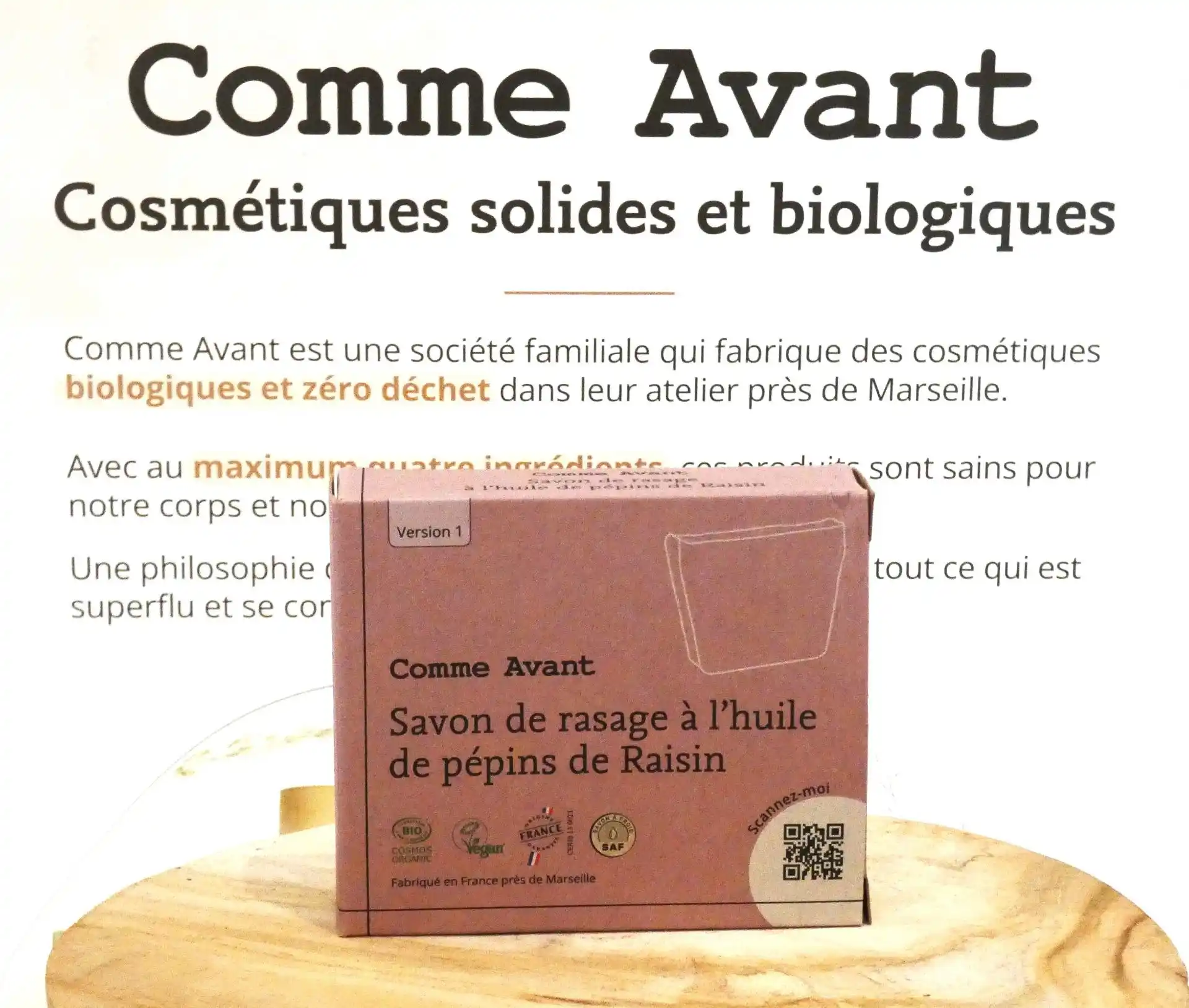 Rasez en douceur avec le savon bio Comme Avant, enrichi en huile de pépins de raisin française, pour une peau hydratée et sans irritations.