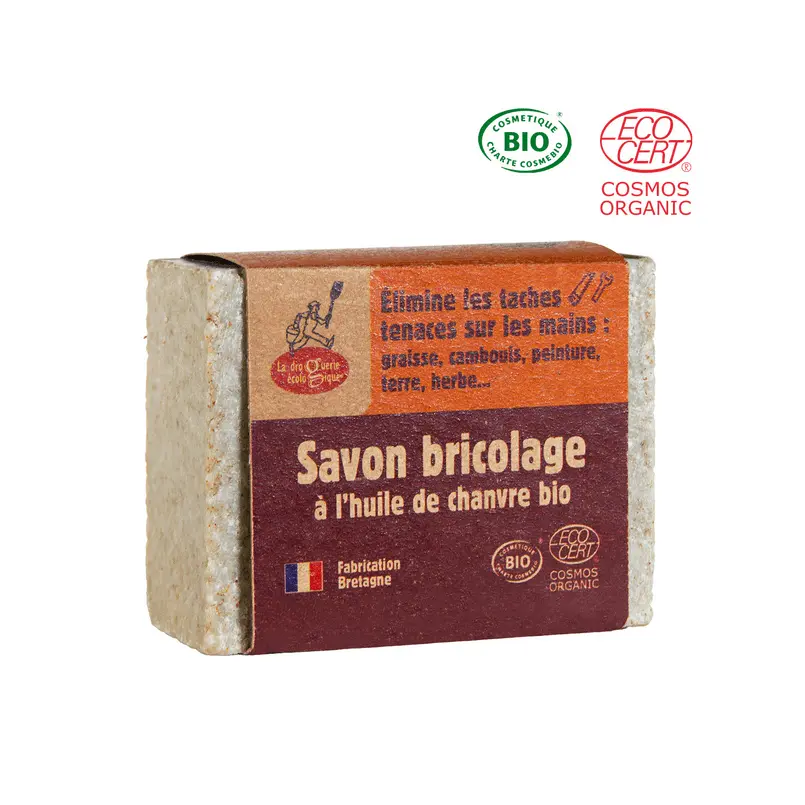 Le Savon du bricoleur bio (150g), proposé par Ker-Gaïa, est conçu pour éliminer les salissures tenaces tout en respectant la peau. Saponifié à froid à partir d’huile de chanvre bio, ce savon 100% naturel intègre une poudre de noyau d’olive pour déloger herbe, peinture, graisse et cambouis. Certifié Cosmos Organic par Ecocert Greenlife, il nettoie en profondeur sans agresser, idéal pour les bricoleurs passionnés. Fabriqué en Bretagne dans une huilerie-savonnerie, il allie tradition et écoresponsabilité. En pain recyclable, il s’inscrit dans une démarche zéro déchet. Parfait après une journée de travail manuel, il laisse les mains douces et revitalisées. Adoptez ce savon pour un nettoyage puissant et une peau préservée !