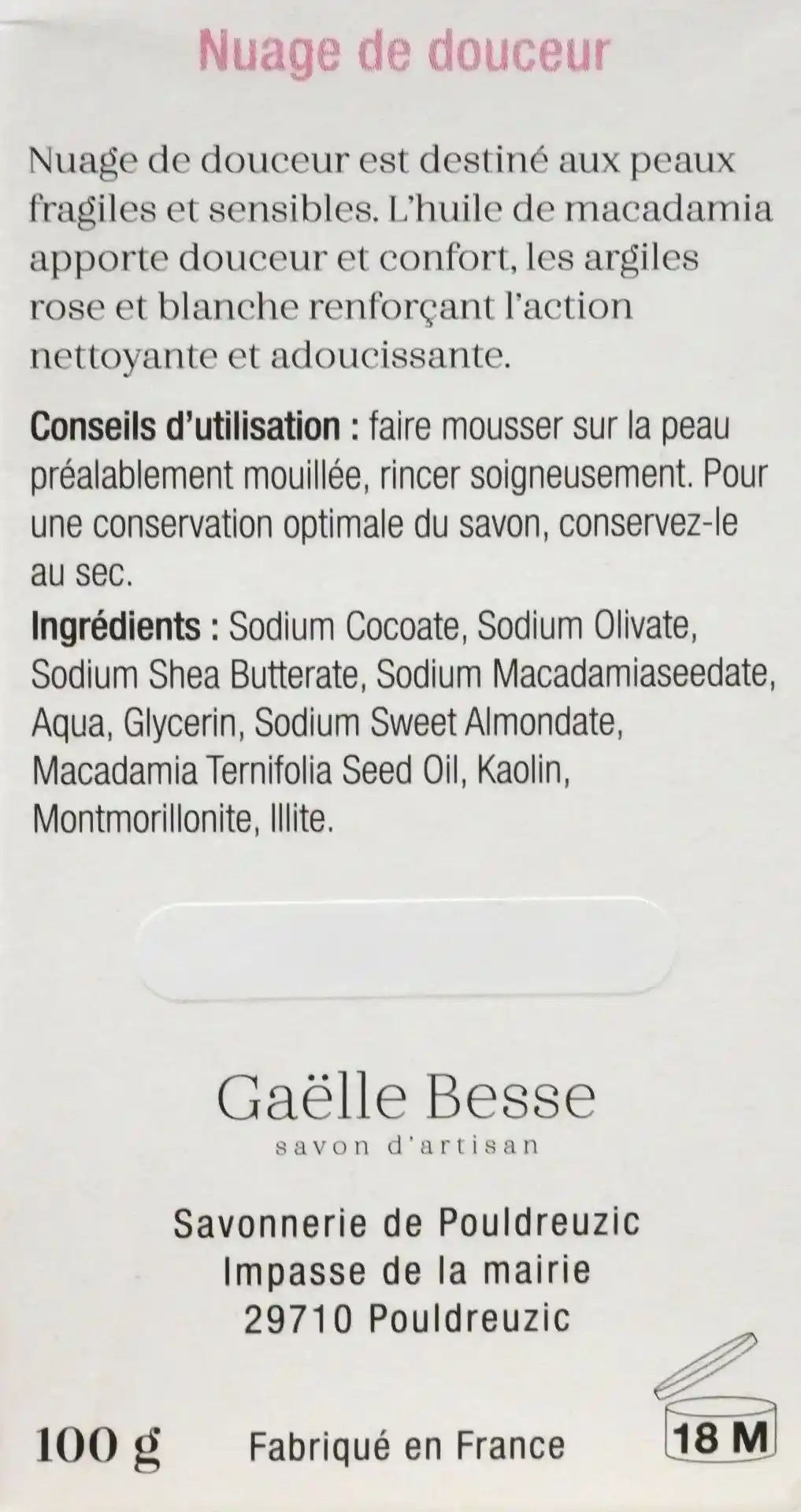 - Composition (INCI) : Sodium Cocoate, Sodium Olivate, Sodium Shea Butterate, Sodium Macadamiaseedate, Aqua, Glycerin*, Sodium Sweet Almondate, Macadamia Ternifolia Seed Oil, Kaolin, Montmorillonite, Illite.