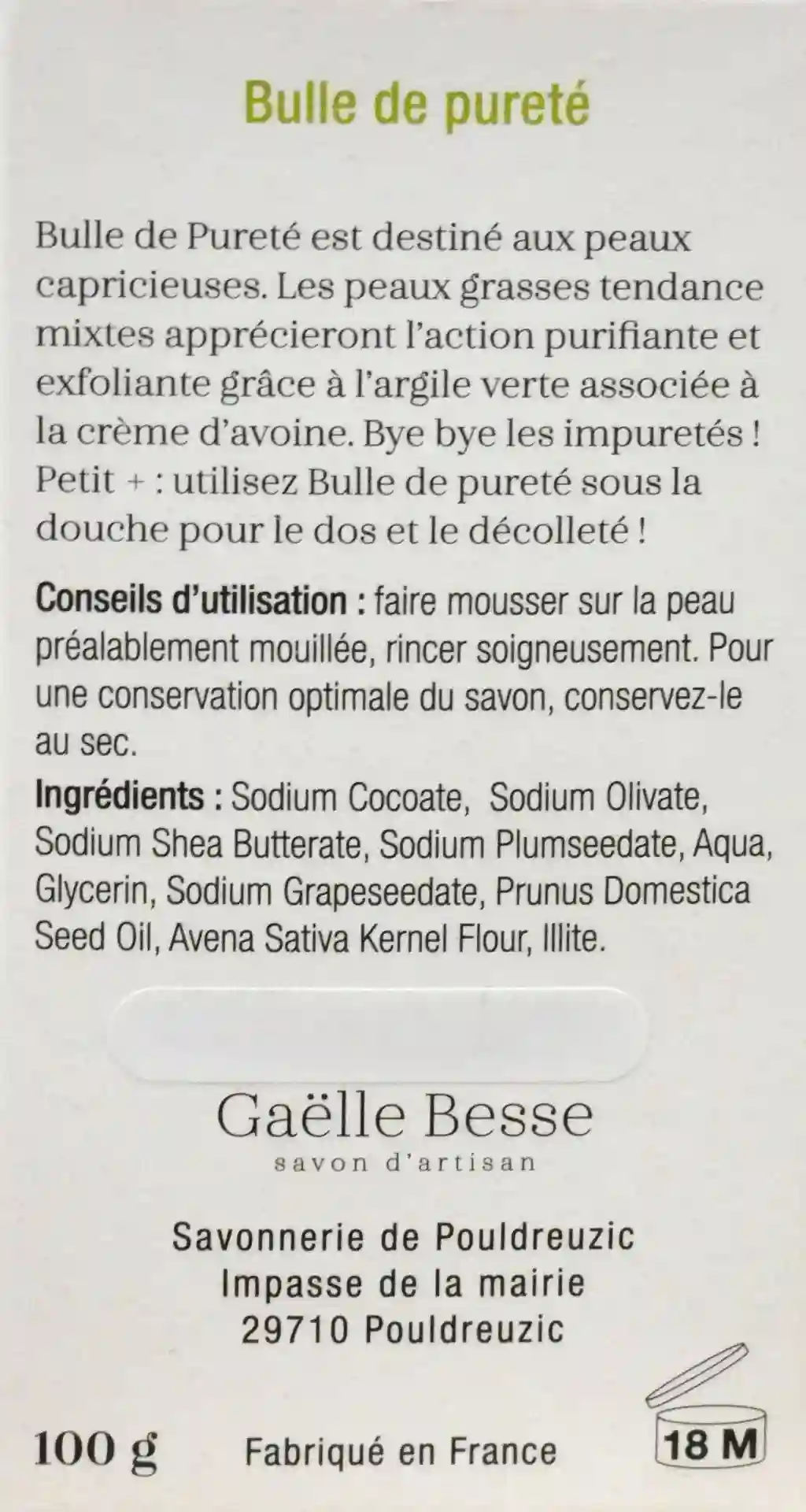 Retrouvez une peau nette avec le savon visage bio Bulle de Pureté Gaëlle Besse, sans parfum, idéal pour peaux mixtes à grasses, nettoyant et zéro déchet.