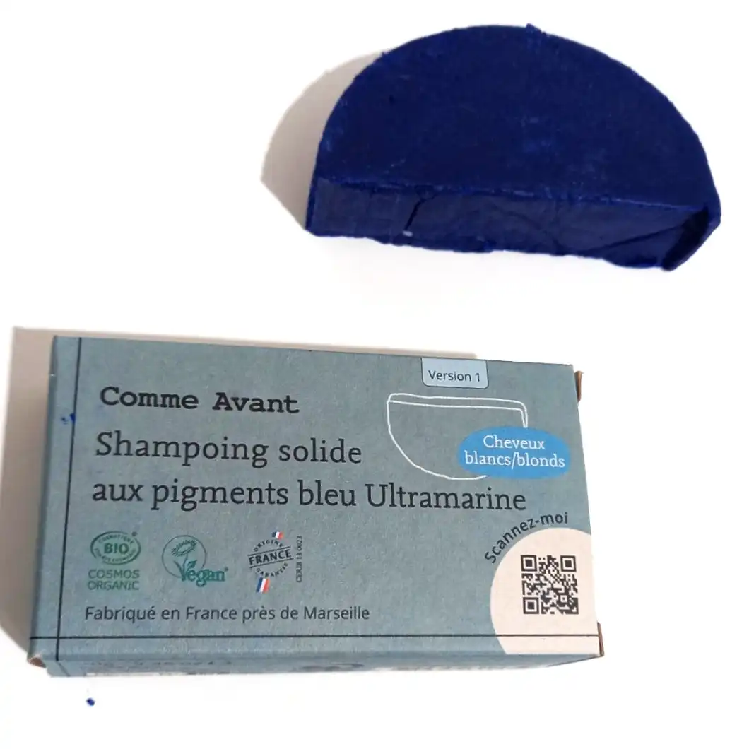 Découvrez le shampoing solide bleu aux pigments ultramarine Comme Avant, un soin naturel qui purifie en douceur pour des cheveux légers et éclatants.