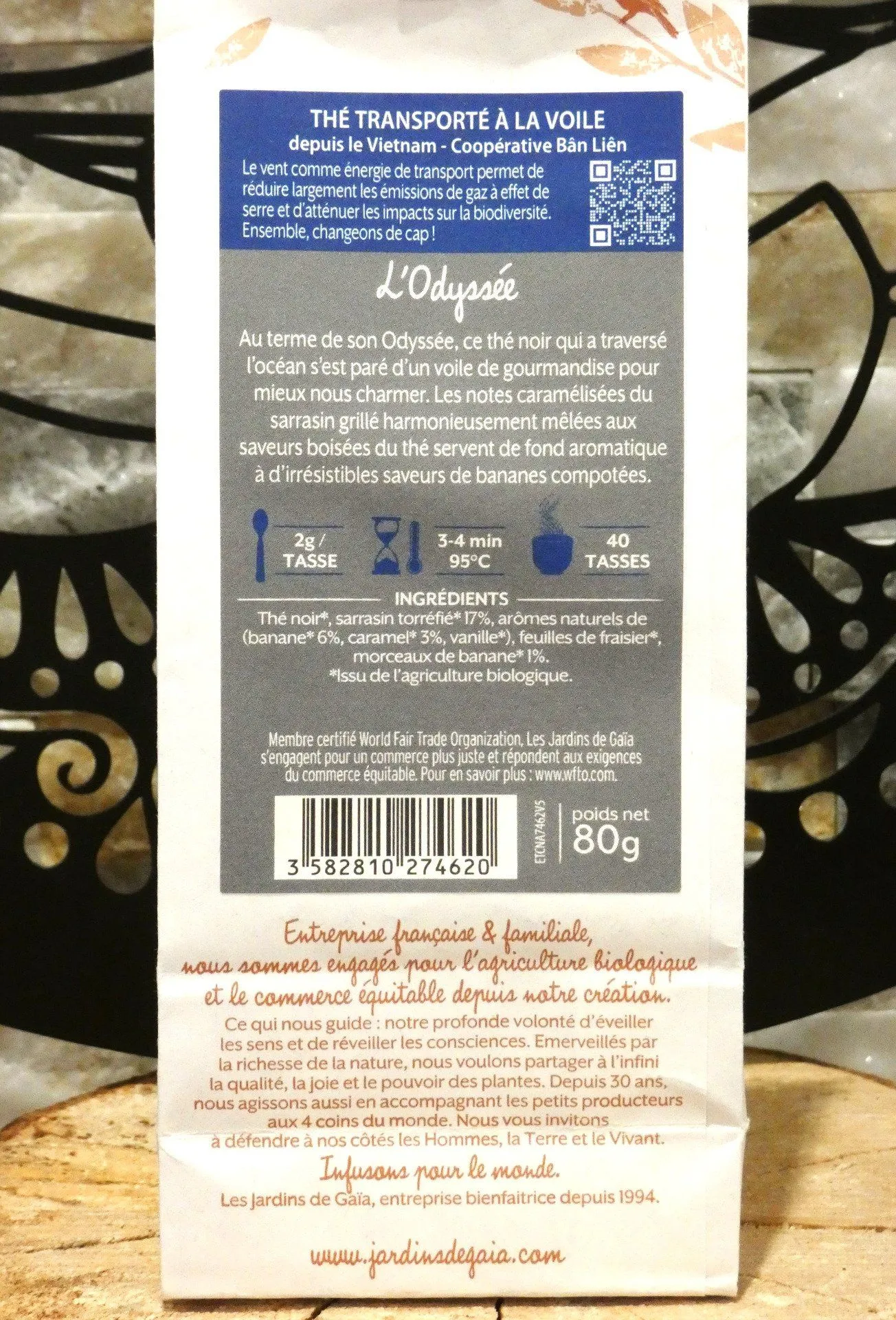 - Certifications : Agriculture biologique (AB), commerce équitable (WFTO), transporté à la voile.