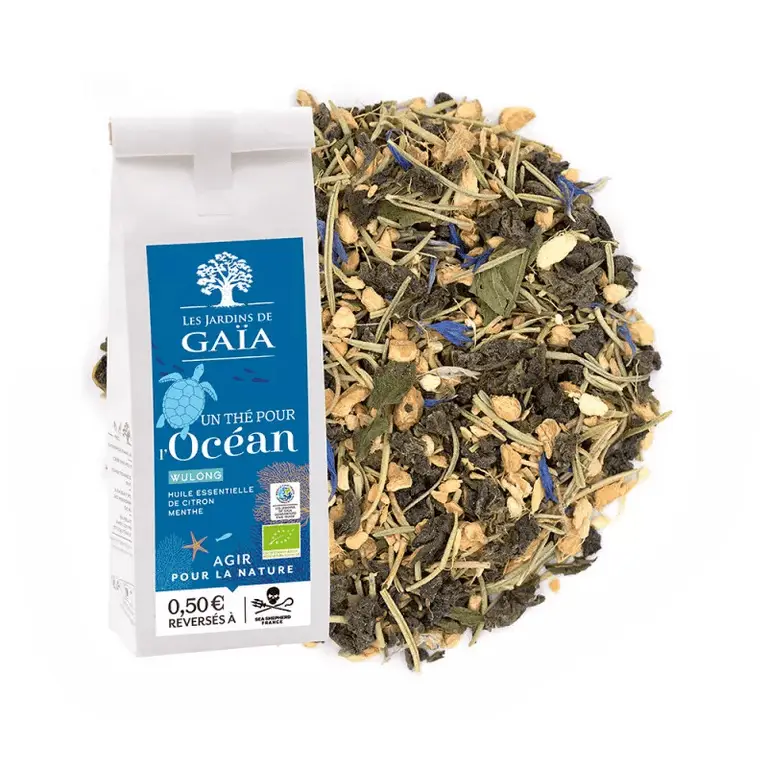 Engagez-vous pour l'environnement avec "Un Thé pour l’Océan". Un thé bleu-vert bio (wu long ou oolong), frais et vivifiant, soutenant des actions de préservation marine avec l'association Sea Shepherd. Disponible sur Ker-Gaia.fr