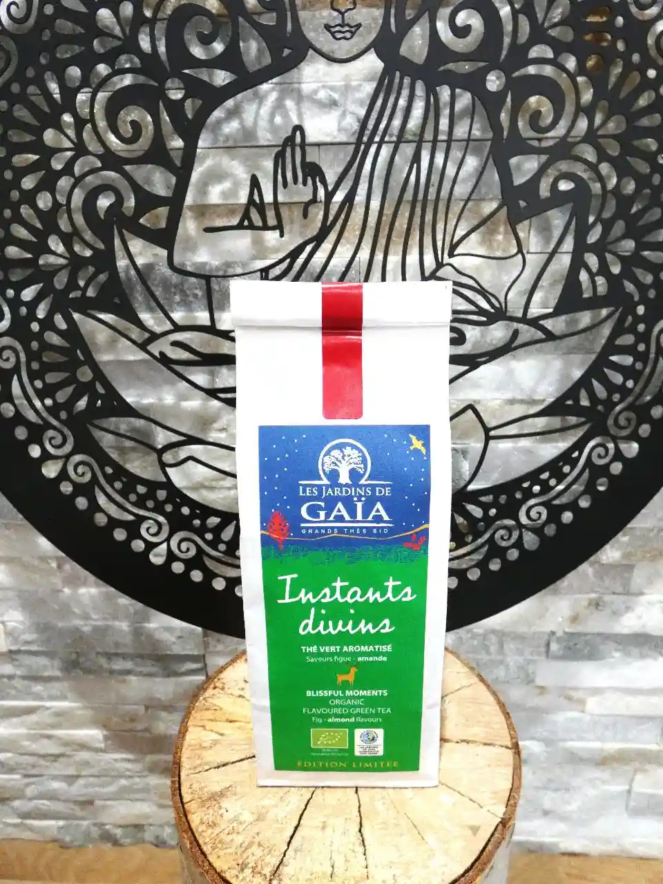 Thé vert bio Instants Divins des Jardins de Gaïa : figue, amande et orange pour une douceur acidulée. Certifié bio et équitable, idéal pour une pause festive.