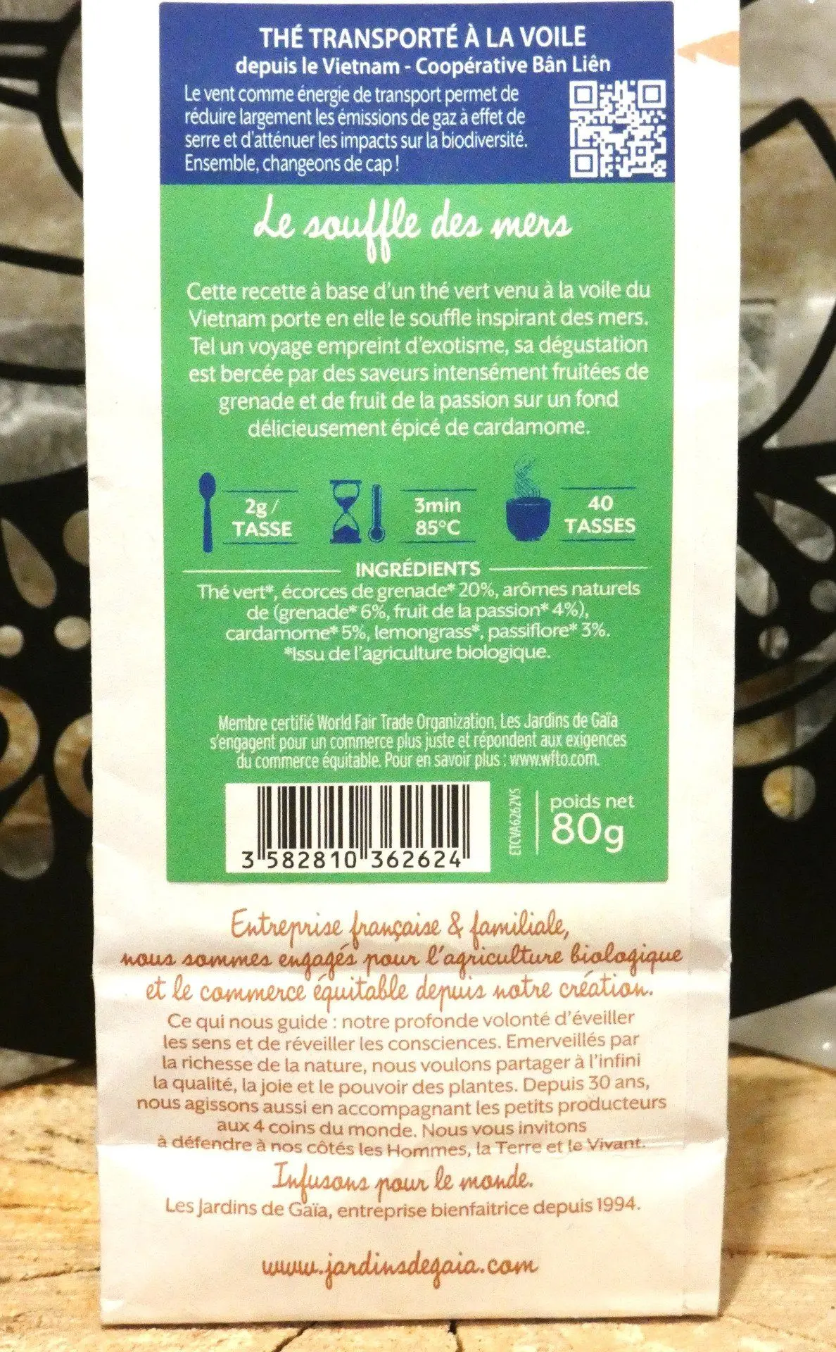 Thé vert bio, transporté à la voile, équitable. Passion, grenade, cardamome. Zéro déchet, pause exotique.