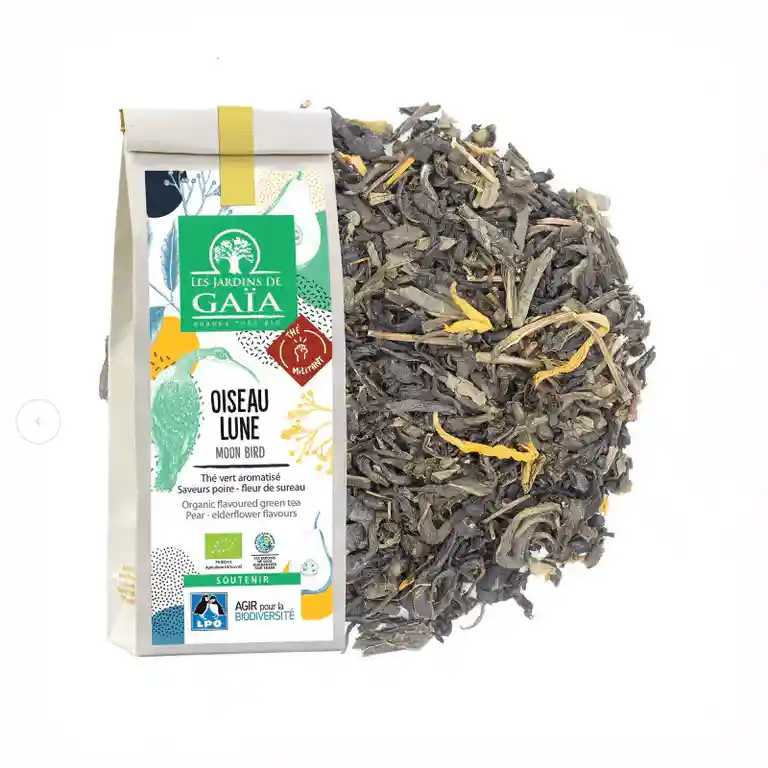 Thé vert bio Oiseau Lune : saveurs délicates de poire et fleur de sureau. Doux, parfumé, idéal pour accompagner vos douceurs. Commerce équitable et bio.