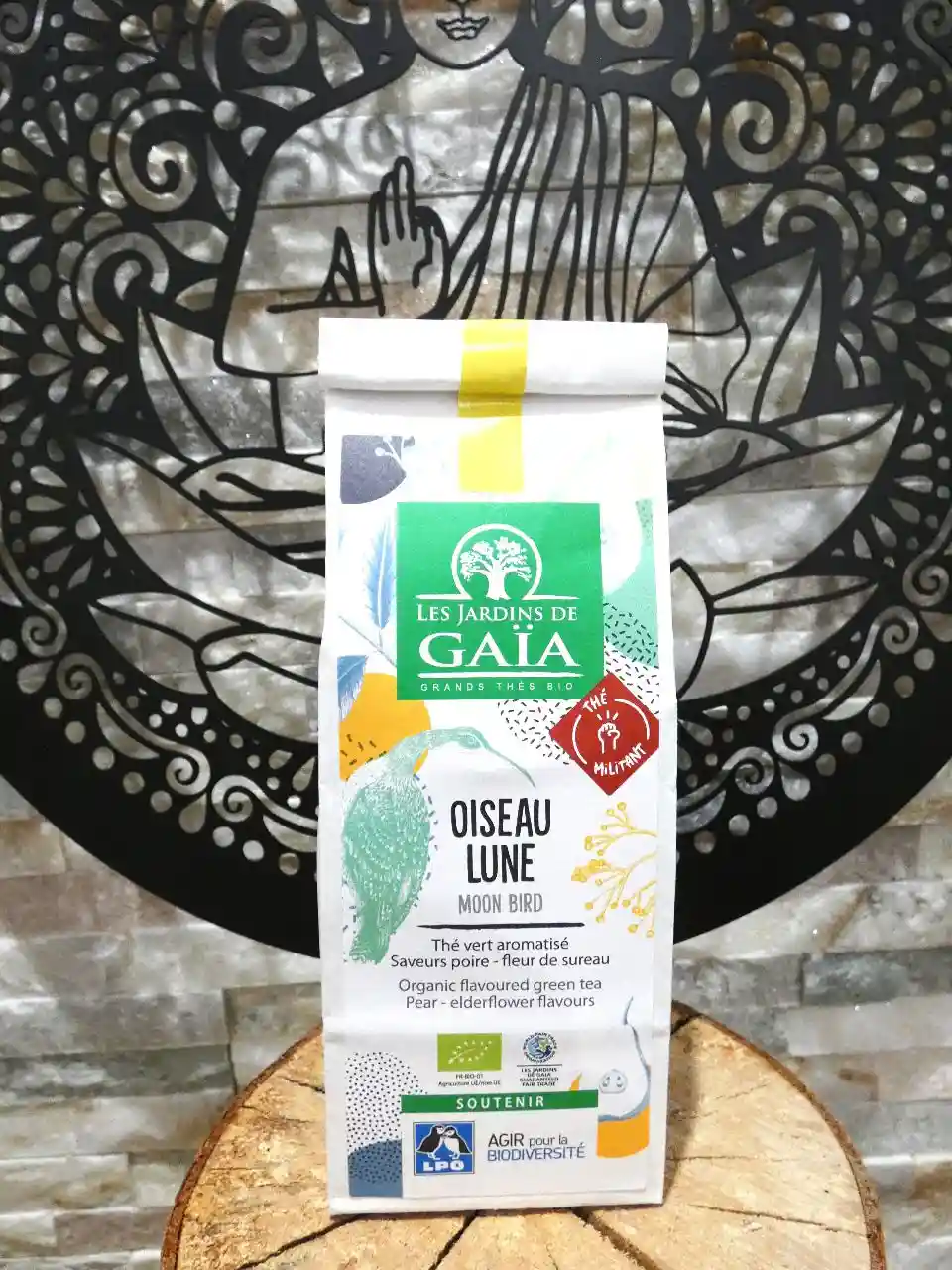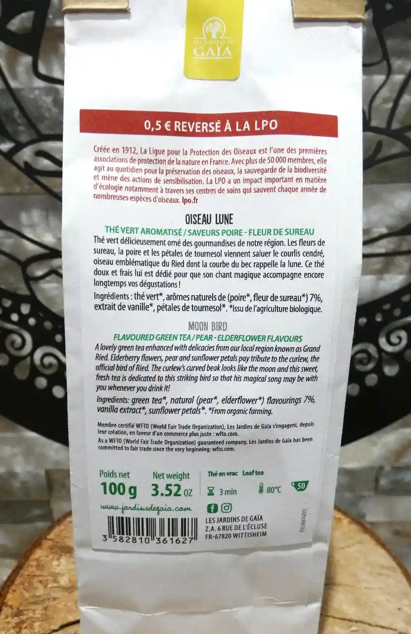 Le Thé vert bio Oiseau Lune (100g), proposé par Ker-Gaïa, est un hymne à la douceur et à la biodiversité. Certifié biologique (AB) et issu du commerce équitable, ce thé vert marie des arômes naturels de poire et de fleur de sureau (7%), rehaussés d’extrait de vanille et de pétales de tournesol. Ses notes fruitées et florales évoquent le chant délicat du courlis cendré sous la lune. En sachet recyclable, il soutient la LPO Alsace (0,50 € reversé par produit). Parfait avec une charlotte à la poire ou un Kouign amann, ce thé invite à une pause désaltérante. Laissez-vous porter par cette mélodie naturelle pour un moment de grâce !