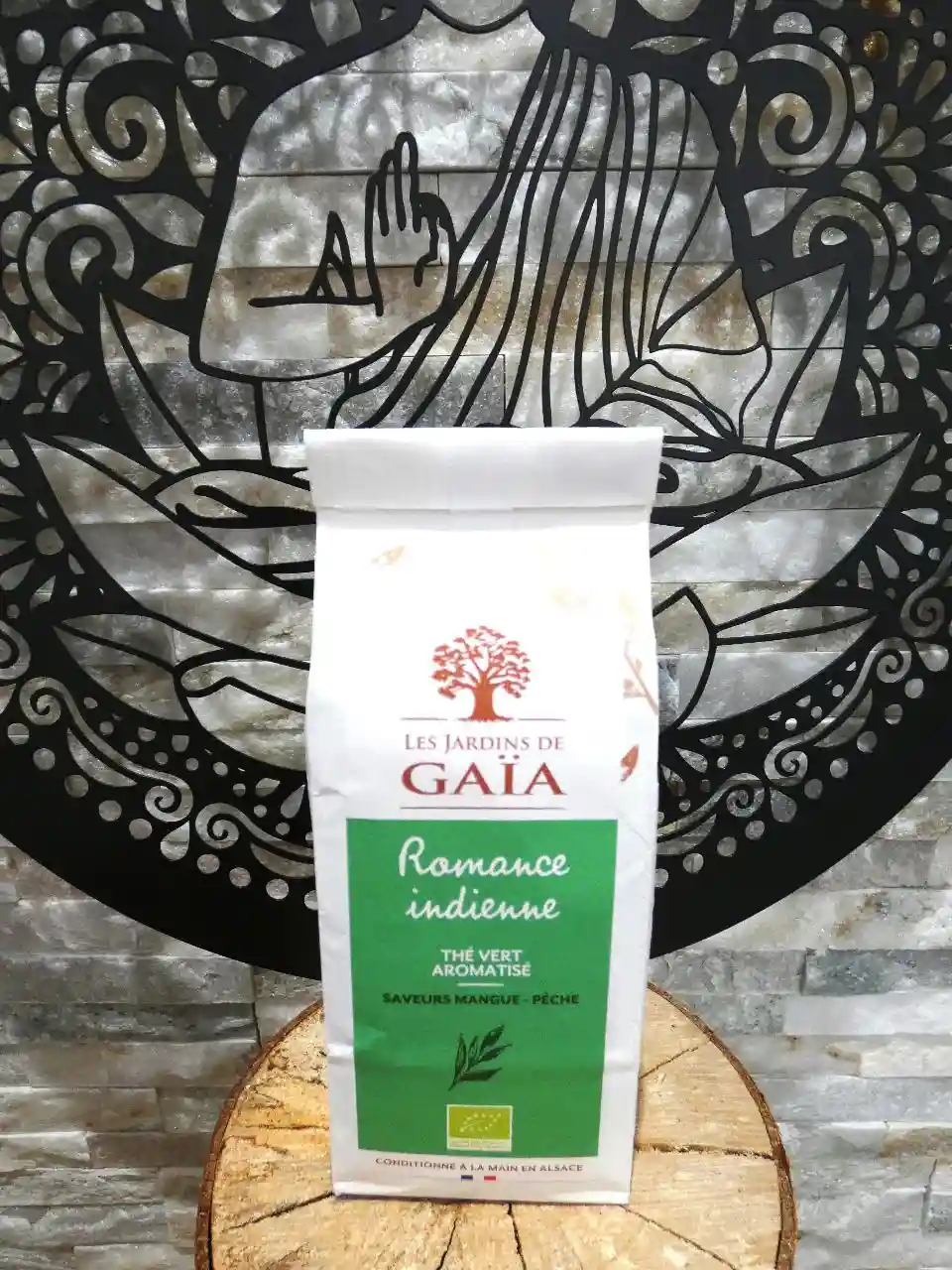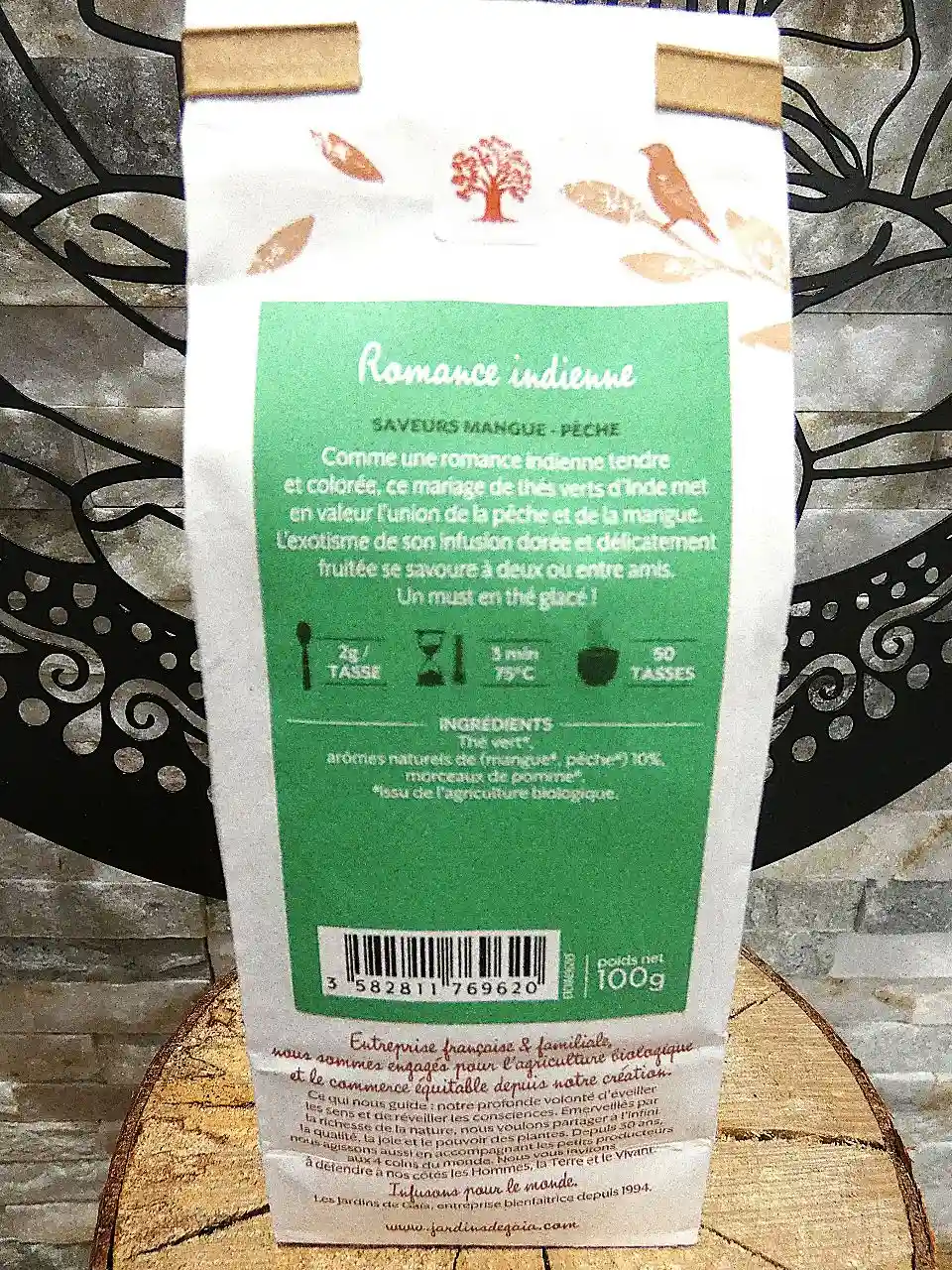 Le Thé vert bio Romance indienne (100g) tisse un voyage sensoriel, scintillant de saveurs fruitées. Certifié biologique (AB) et équitable (WFTO), ce thé vert d’Inde marie des arômes naturels de mangue et pêche (10%) à des morceaux de pomme. Son infusion dorée, caressant le palais avec une douceur exotique, éveille les sens et invite à la détente. Lové dans un sachet recyclable, ce thé incarne l’écoresponsabilité. Parfait en thé glacé avec un entremet à la mangue ou un Gulab Jamun, il transporte vers des instants partagés. Adoptez-le pour une pause romantique !