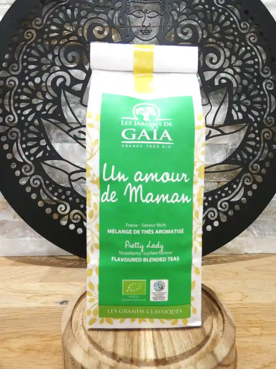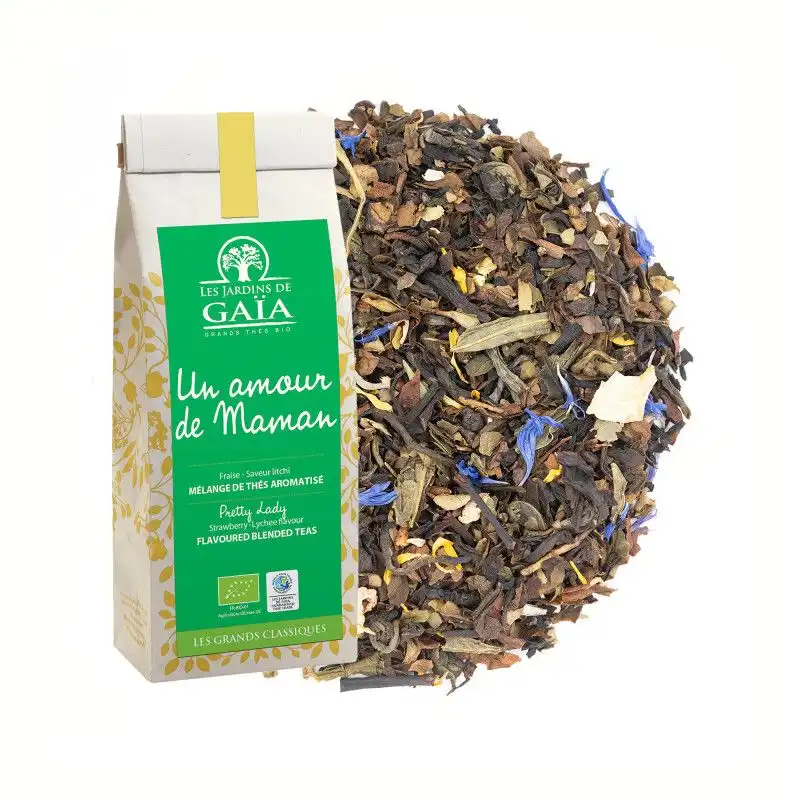 Savourez la douceur du thé bio "Un Amour de Maman". Un mélange délicat de thés vert et noir et de notes florales et fruitées, parfait pour une pause réconfortante. Disponible sur Ker-Gaia.fr.