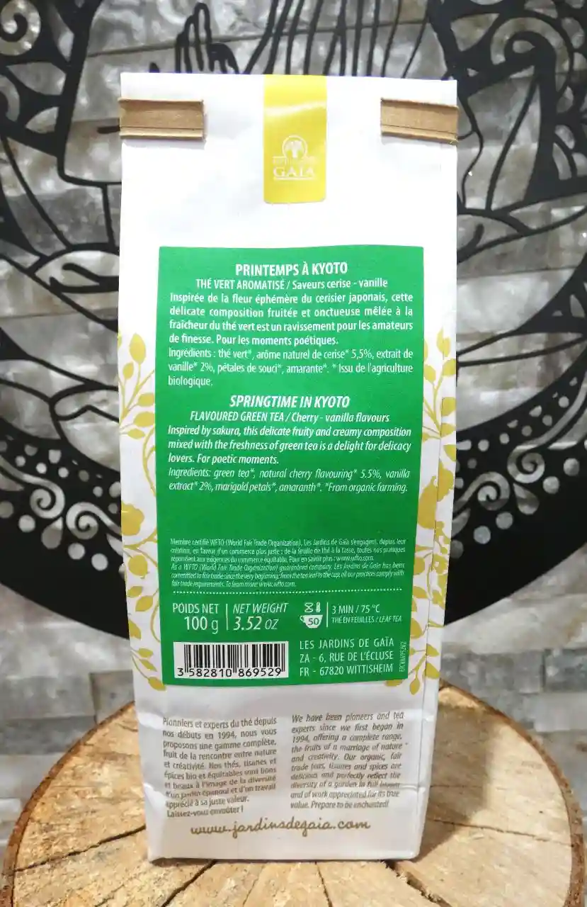 Le Thé vert Printemps à Kyoto bio (100g), proposé par Ker-Gaïa, est une ode aux cerisiers en fleur du Japon. Certifié biologique (AB) et issu du commerce équitable (WFTO), ce thé vert marie des arômes naturels de cerise (5%) et de vanille (2%) à des pétales de souci et d’amarante. Ses saveurs délicates, à la fois fruitées et suaves, évoquent une promenade printanière sous les Sakura, où les pétales dansent dans l’air. En sachet recyclable, ce thé allie élégance et écoresponsabilité. Parfait avec des mochis ou une mousse de fruits rouges, il invite à un moment de grâce. Laissez-vous transporter par cette harmonie florale pour une évasion sensorielle unique !