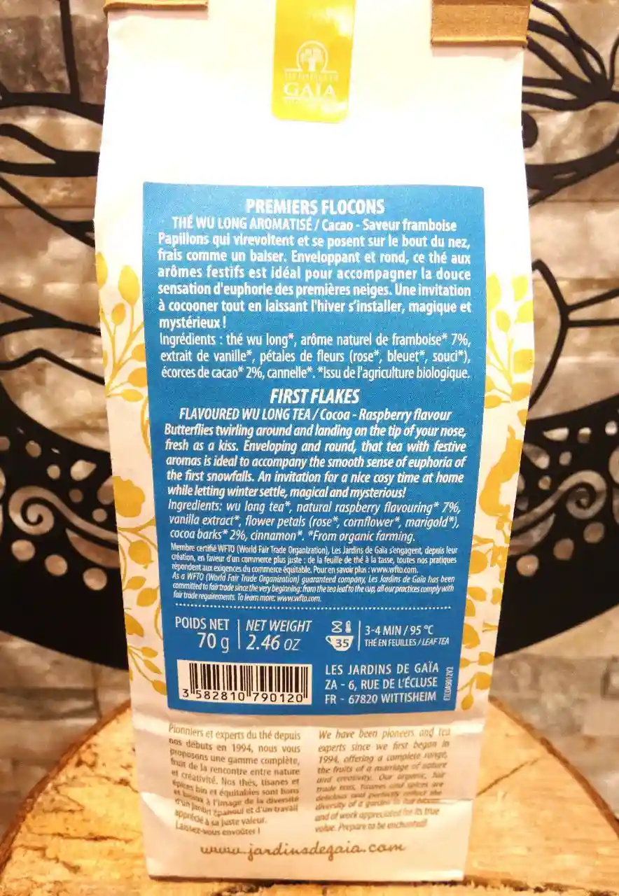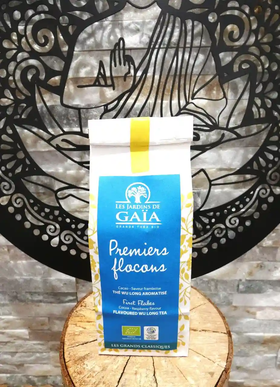 Thé wulong bio Premiers Flocons des Jardins de Gaïa : cacao, framboise et cannelle pour une infusion festive. Certifié bio et équitable.