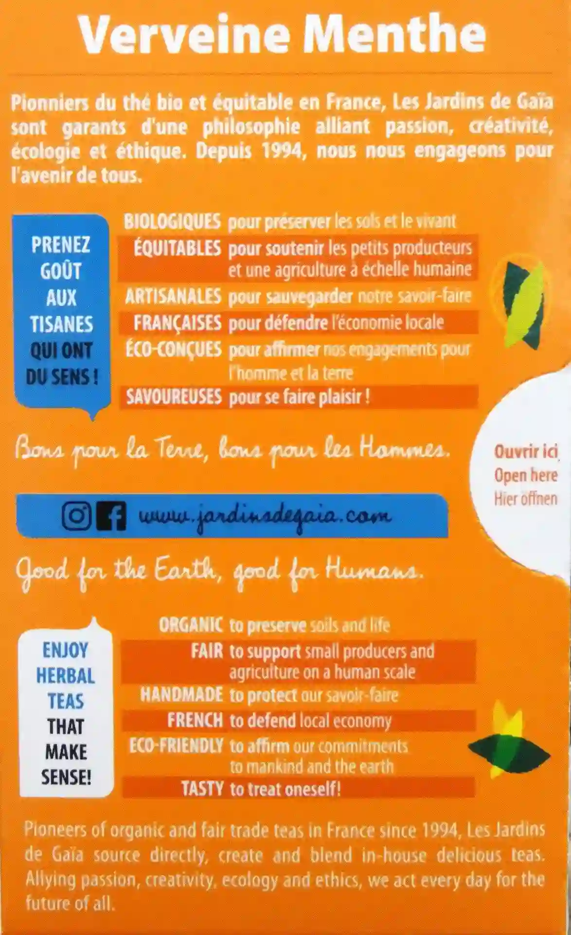 - Composition : Verveine (60%), Menthe douce (40%). 100% d’ingrédients d’origine naturelle, 100% issus de l’agriculture biologique.
